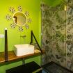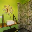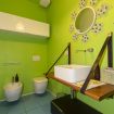 Il bagno è spazioso, sono presenti wc e bidet, lavandino con specchio decorato e un'ampia e comoda doccia.
