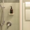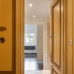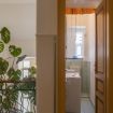 Sulla sinistra del piccolo disimpegno all'ingresso si trova la porta dell'ampio bagno, con doccia, sanitari e un grande specchio.