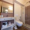 Il bagno è moderno, funzionale, con una doccia ampia, wc con doccino e un grande specchio.